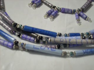 I had my Grand niece and nephew write something to their mom. Kelly wrote, "I love you Mom, Kelly 8". Coleton wrote his name and the number 5 for his age. I carefully cut those words out making each word into a paper bead. On one strand of the five strand necklace, I put the beads "Kelly" and "8". They are in dark blue in the inner strand. In a middle strand on gray and black paper are the beads "Coleton" and "5". Then on the lowest strand again in blues are four final beads: "I" "Love" "you" and "Mom".